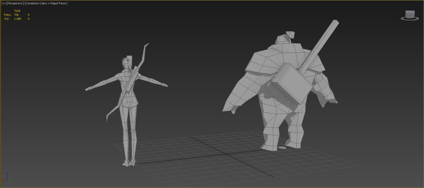 As a quick conclusion, I'm pretty pleased with how these two turned out. Personally I feel that I achieved the goal of creating a dichotomous duo, with a consistent style and strong silhouettes. While at first I wanted to create a very high poly model, there was a lot to learn from creating characters under these kinds of technical restraints. It forced me to think solely about the strength of their overall design, and how I could best utilize my tri and texture budgets in order to convey their designs as best I could.
